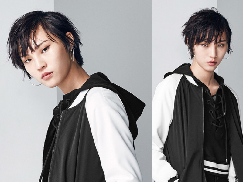 “狗啃式”刘海搭配二八分的黑色短发,打造出小凌乱让整体富有层次,既避免死板又提高发型的空气感,利落的燕尾使发型呈现出中性的风格,让人耳目一新。再融合了两侧碎发的设计,拉长了脸部的线条,让五官轮廓更为柔美。