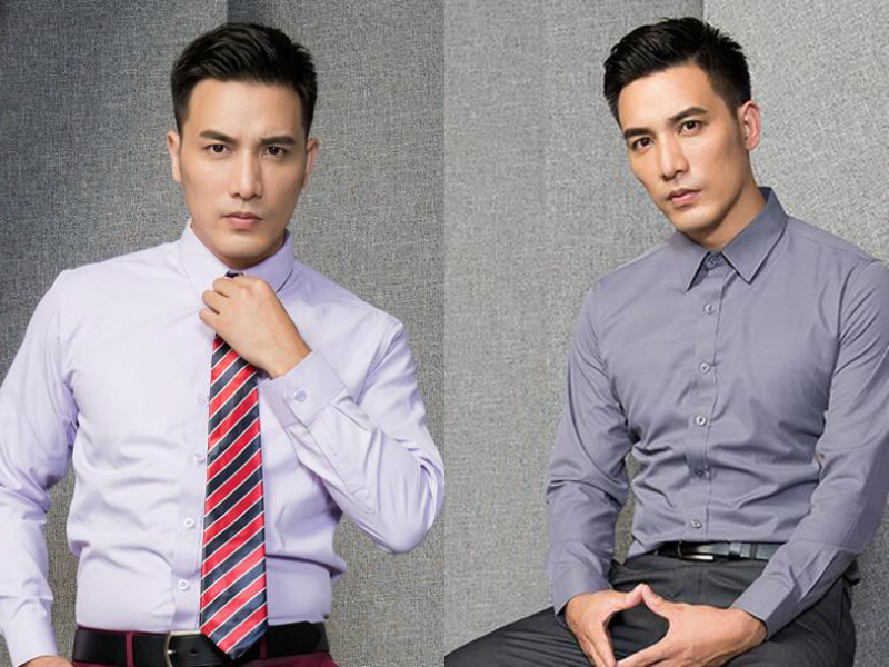 无刘海遮挡使男士硬朗的面孔展露无遗,两侧鬓角修剪利落干净,突出男士阳刚的脸部线条,一头短发全部往上梳起,造型打理得整体有型,穿上衬衫加上凌厉的眼神瞬间给人一种霸道总裁的既视感。