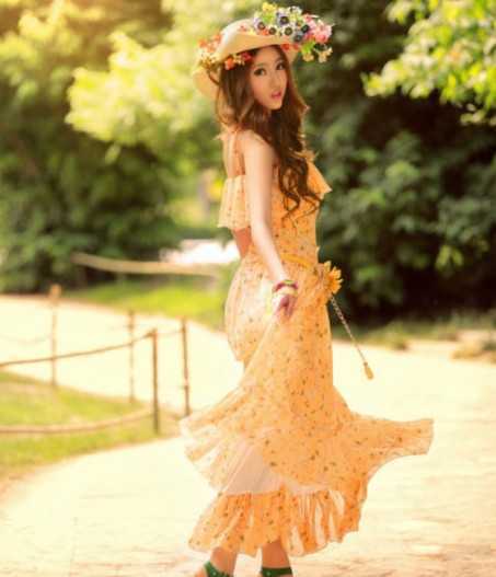 中分长卷发可以带给你气质感,微黄的发色,搭配花朵草织帽,是夏季出游最佳的选择,还有那碎花的吊带裙,浪漫极了。