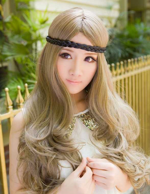 好美的中分卷发发型,黄白色的长卷发美极了,超赞哦,显得皮肤更白哦,额头一条黑色的麻花辫增添了甜美气质,有点仙女的感觉,纯净唯美的感觉。