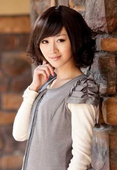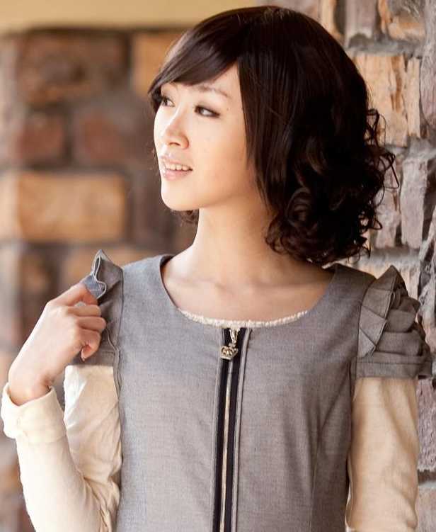 一个浅浅的微笑,甜美哦,斜刘海更添了几分甜美,有点蓬松感的卷发很显气质,给人一种优雅甜美的感觉。
