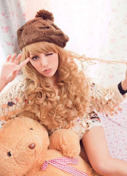 好可爱的蛋卷长发,黄白色的头发显得肌肤更白哦,而且时尚感十足,斜刘海搭上一顶甜美可爱的针织帽,超甜美超可爱哦,长长的蛋卷发丝,添了甜美感,太可爱了。
