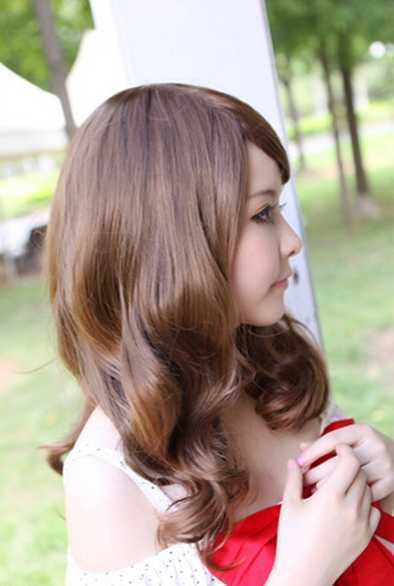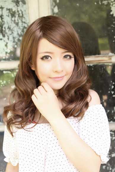 一眼看过去,交错的斜刘海显得很甜美哦,中长的蛋卷发,修饰脸型的效果很捧,黄棕的发色添了时尚感,而且显得肌肤变白咯,无论从正面还是侧面看都很甜美哦。
