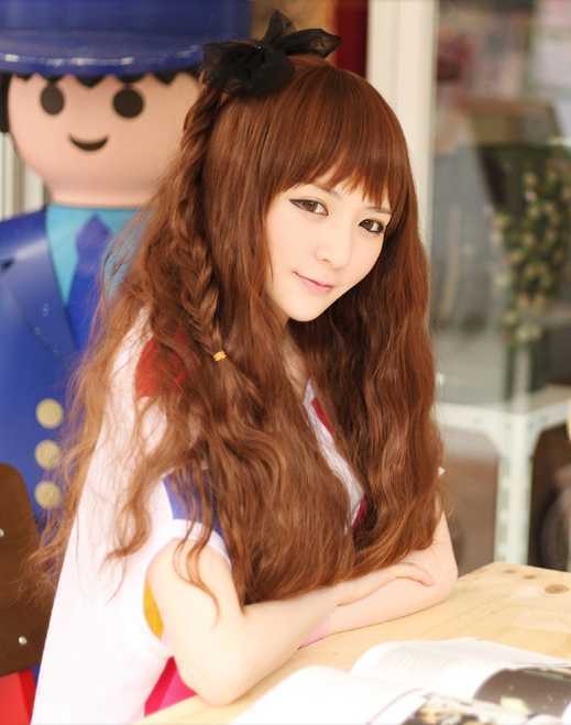 碎碎的齐刘海,蓬松的蛋卷长发,超有范,可爱又俏皮,稍带黄色的发色显得很时尚哦,自己diy一条麻花辫,瞬间为甜美加分,减龄效果也很捧哦。