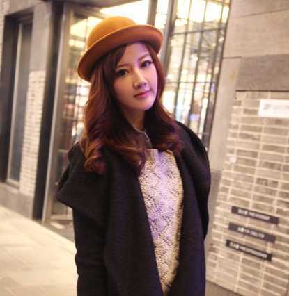 斜刘海,添了甜美气息,红棕的发色,气质又时尚,再搭一顶帽子,超美的。
