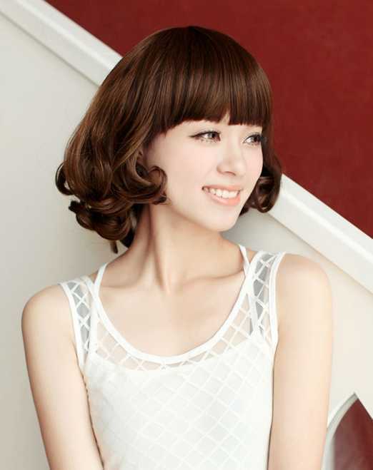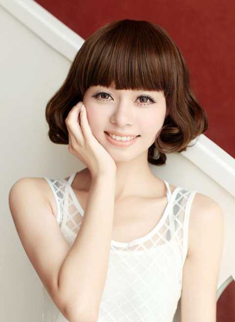 齐刘海搭上短发蛋卷头是今年很流行的韩式发型,显得甜美可爱,