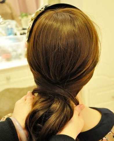 步骤三:两颊的头发向内绕卷起来,然后用发带绑起来就可以。