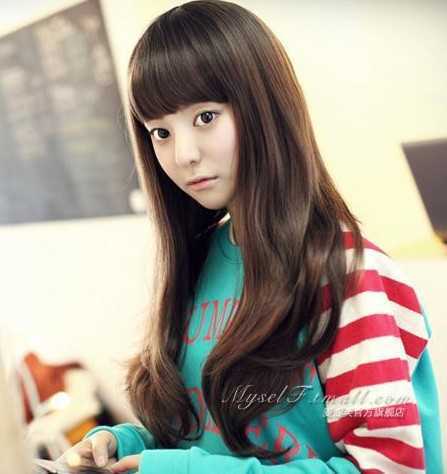 前面的齐刘海,带给人一种甜美范,两颊内卷发尾,更是修饰了整张脸颊,很美!减龄又修脸哟!深棕的发色更是添加了时尚感。