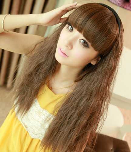 玉米烫卷发发型图片六:齐刘海浅棕长玉米烫卷发