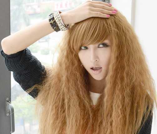 look.4》》浅黄斜刘海爆炸玉米烫长卷发