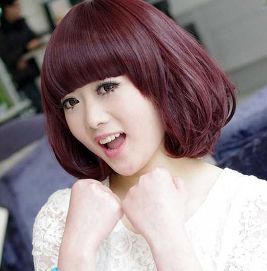 一头最抢眼的酒红发色,出街最吸人哦!前面剪齐的刘海,倍添甜美,两颊经过烫染过的烫卷发丝,制造出来的蓬松感,瘦脸效果十分好,精致小脸凸显!