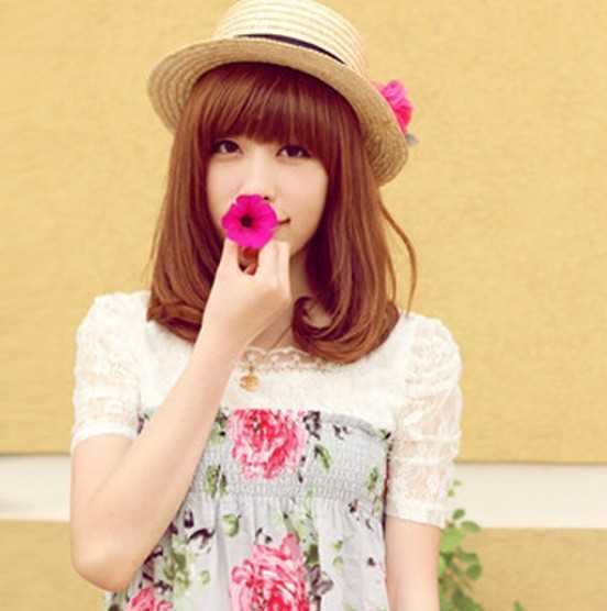 这样的中长卷梨花头同样是非常的好看漂亮,减龄的效果超棒的哦!盖眉的厚感齐刘海,对修颜起到了十分完美的作用,嘴上含花朵和编织帽子的装点下,凸显那种淑女恬静的自然气息。