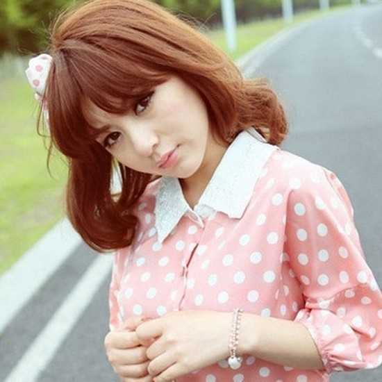 可爱的小女生,在棕色系的中长卷发下,变得俏丽亮眼又不失小妩媚感,随意散开的齐刘海凸显那精美的小看的,波点发饰和服装的搭配,甜美的小清新感觉。