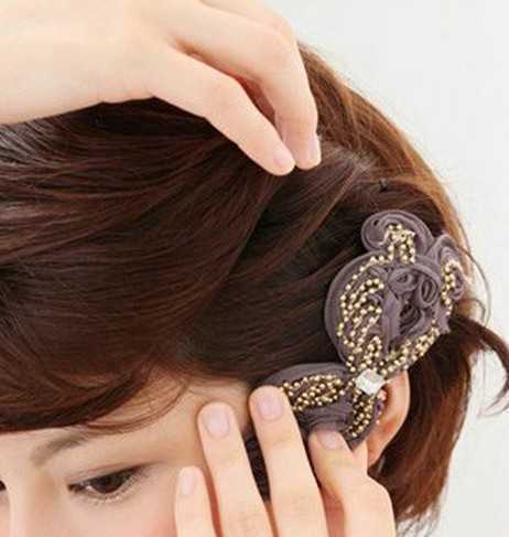 4、接着佩戴上精美的发饰来遮盖发卡。