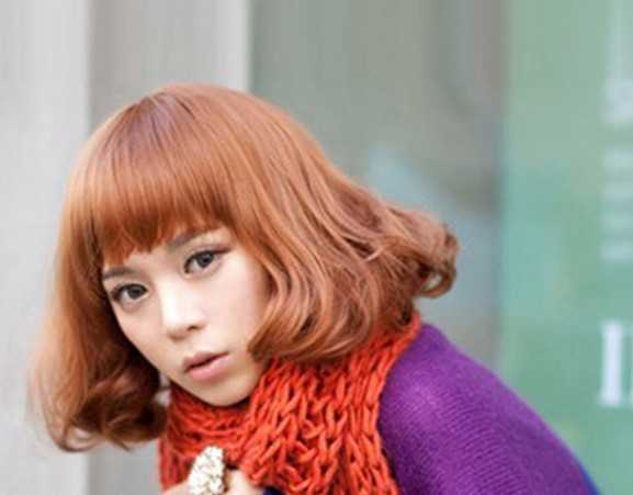 2014年韩系的齐肩蛋卷头发型,蓬松的卷烫发尾,营造出自然慵懒的感觉,碎碎的齐刘海修剪,搭配棕黄发色,衬托白皙肌肤外又是时尚一大体现。