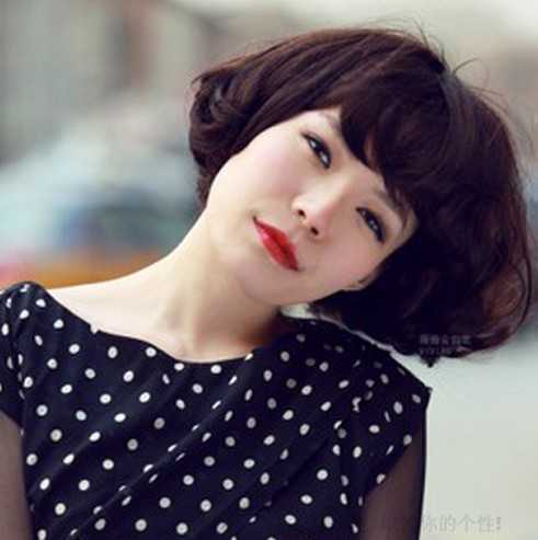 复古系的蛋卷头烫发,及眉的斜刘海凸显了女生优雅甜美的红唇妆,再融入棕栗色染发那就是时尚十足了哦!