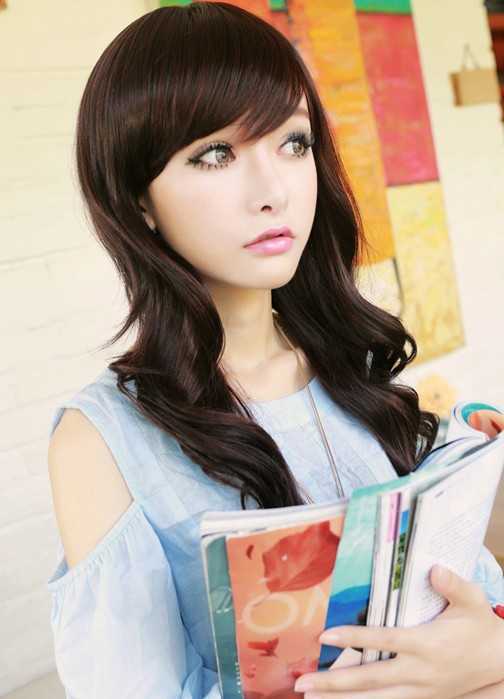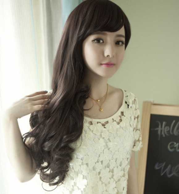自然、蓬松的大波浪长卷发,充满韩式风格,斜开的刘海,最显甜美,全部的头发都搭在肩的一边,很有气质不是吗?新潮时尚。