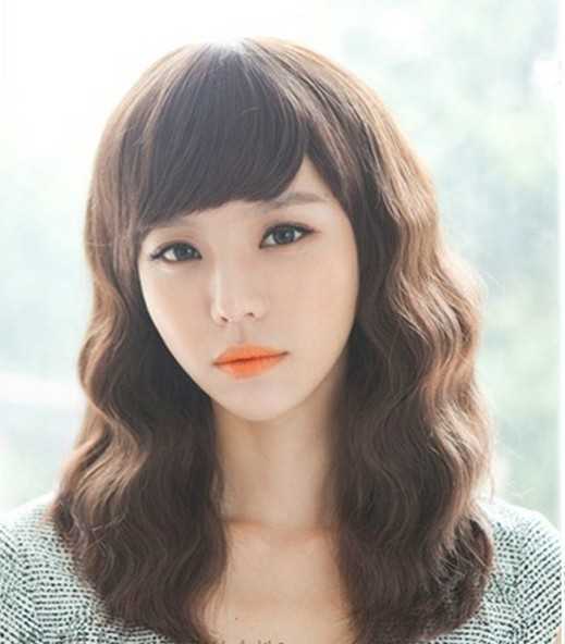 小清新妹子最爱的一款中长蛋卷头发型,微微斜开的短刘海,有修颜的作用,大波浪的烫发结合精致橘色妆容,让女生显得特别复古而有个性。