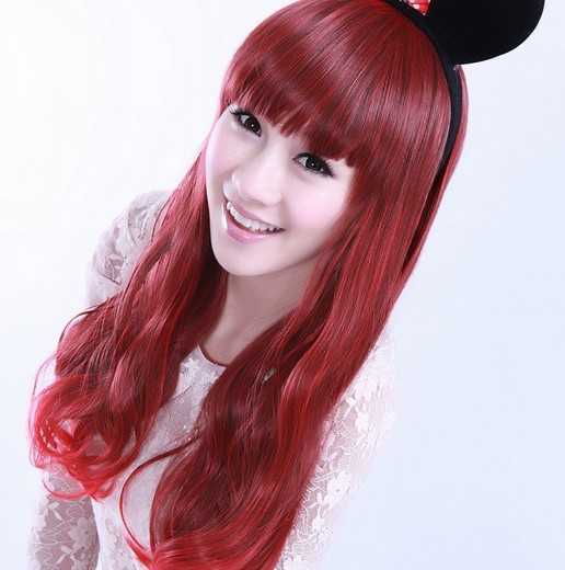 超潮流抢镜的酒红发丝,在一款齐刘海长卷发的完美结合下,尽显俏皮可爱的感觉,搭配可爱发带又赋予青春活力感哦!