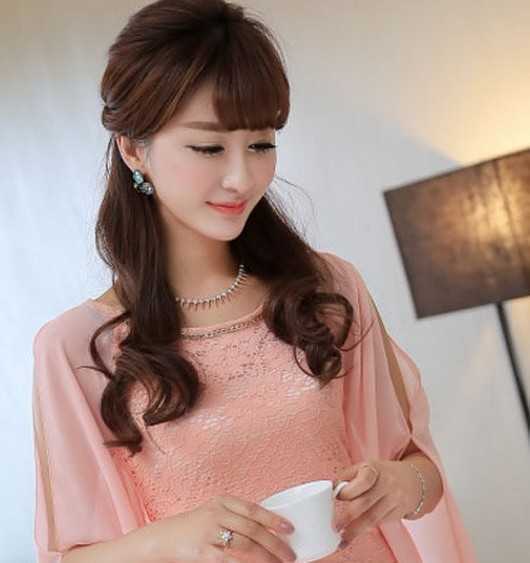 时尚的公主式半扎,将这款大波浪长卷发展现得无比高贵气质美感,短短的斜分刘海,甜美的连衣裙装扮,清新淑女形象轻松呈现。