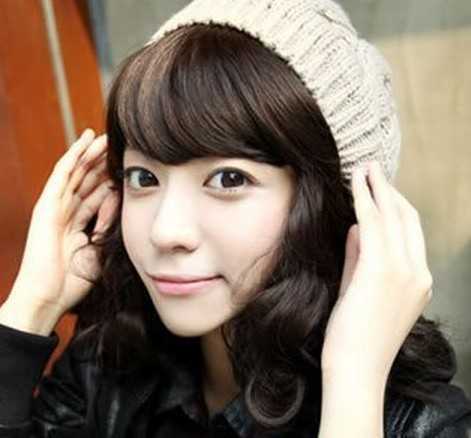 厚重的中发蛋卷头发型设计,厚厚的刘海凸显出明亮清澈的大眼睛,搭配毛线帽子也很IN很可爱!是一款今年特别时尚的韩式发型。