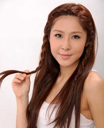 一头棕色的微卷长发,将刘海编成发辫形状,挺清爽的,甜美更适合夏季。