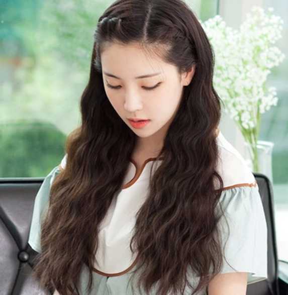 蓬松度的长发蛋卷头发型,选择深栗色的染发,不夸张显时尚好看,中分刘海尽显简单编发,露额的设计却是气质甜美。