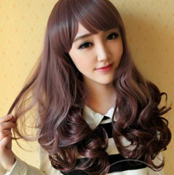 淡淡的紫色染发,靓丽潮流范儿!活泼似的蛋卷长发,配合上厚感的斜刘海,再化个红唇妆容,迷人恬静气息。