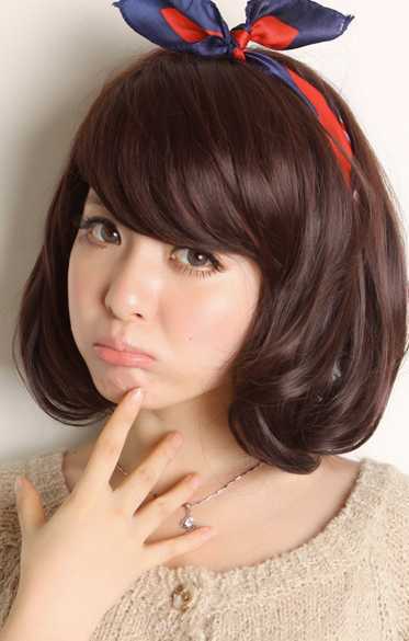 比较流行的一款女生短卷发发型,内扣式的发尾弧度,轻松就能塑造一张标志小脸蛋了,无辜的表情动作,搭配兔耳朵发饰,俏皮显清秀可人。