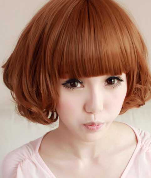 萝莉范的一款夏季女生短卷发,亮丽的棕黄发色的搭配后,让整体造型变得时尚有气质起来,整齐的刘海设计,嘟起的小嘴动作,可爱极了。