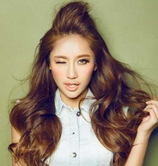 这款发型在肩膀处头发开始烫上大波浪卷,披散的头发显得十分优雅俏皮,头顶处打造出蓬松高耸效果,显得饱满大气,给人一种慵懒的魅惑感。