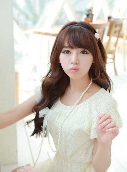 公主头的超长卷发发型,前后披肩的卷发,柔美显浪漫气息,弧度斜分的刘海设计,搭配精致发箍,瞬间演绎出可爱又高贵的女生形象。
