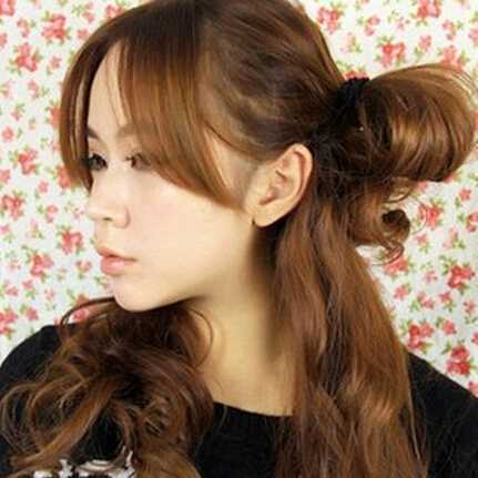 3、然后将上步橡皮筋处留出的头发分成两部分,朝不同方向拉松散,形成蝴蝶结的形状。