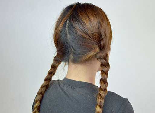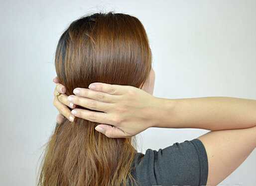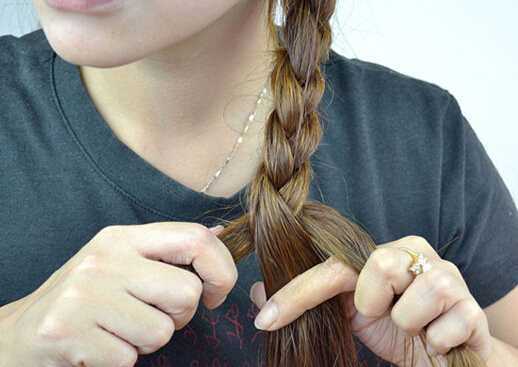步骤4、从一侧头发挨近中线的地方取一小缕头发,把这缕头发分为3部分,然后开始编麻花辫,编的时候,每操作一次要从旁边往麻花辫加入发束,直至编完,最后在发尾处用橡皮筋固定;