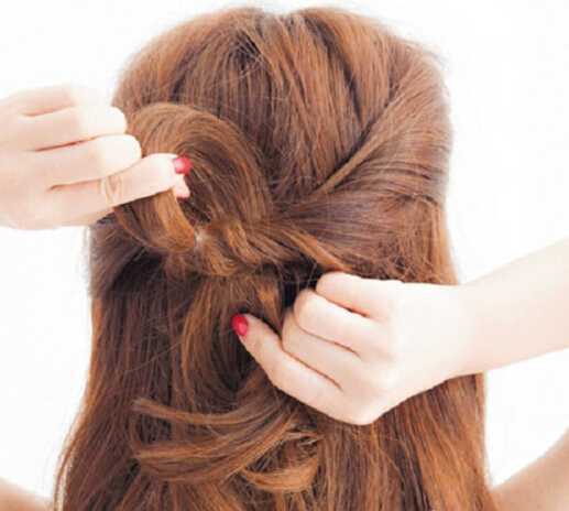 步骤二:将两条发束固定在一起,再将发尾塞到里面。