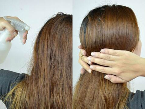 睡觉前,你可以洗头并使其在半擦干的情况下编发,又或者如图中MM所示在干发上喷洒清水,让头发湿润。接着,我们往头发上涂抹卷发凝露,有助定型。