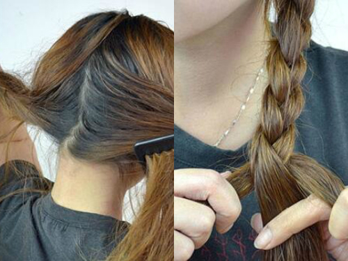 将头发分成左右两部分,编成三股辫,编至发尾时使用橡皮筋扎好。