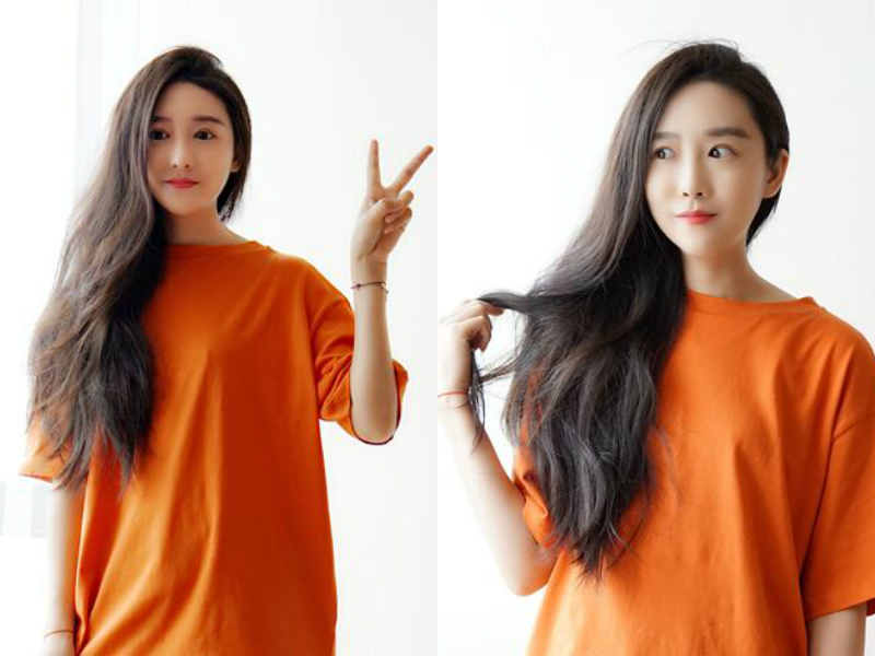 相比于前一款大幅度的侧边卷发发型,这一款要显得低调很多,只是在接近发尾的地方带有些弯曲的痕迹。女生长长的头发健康而浓密,全部捋在一起并垂放在一侧肩膀前,打造出了一款极不对称的造型,却依然让人看了很舒服,漂亮的脸蛋也在这两边不对称的设计中显得愈发精致,本是时尚女神的形象在女生打出“耶”的手势下变得俏皮灵动起来,感觉很平易近人。