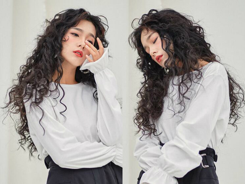 满头的小卷毛看起来略显凌乱,却别有一番风情,及腰的长发经过卷烫变得蓬松感十足,根根发丝都充斥着弯曲的线条,就连刘海也是卷曲翻翘,显得很特别,经典的黑发使本应夸张的造型变得自然顺眼,仿佛这一头卷发是女生天生的一样,很是漂亮。