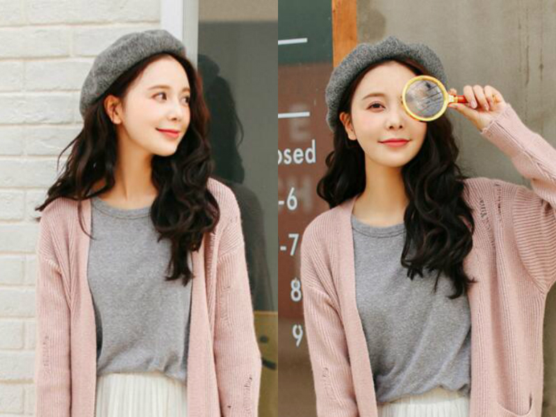 没有刘海遮挡的额头看起来很是清爽,也突出了女生干净的小脸蛋,头戴一顶以前很流行的毛线蓓蕾帽增添了中世纪贵族小姐的气息,整体造型轻松融入复古感。波浪状的卷发随意披在肩前,一侧则夹至耳后,恰好露出女生优美的脸颊线条,搭配针织服饰不经意间展现了女生柔美的一面。