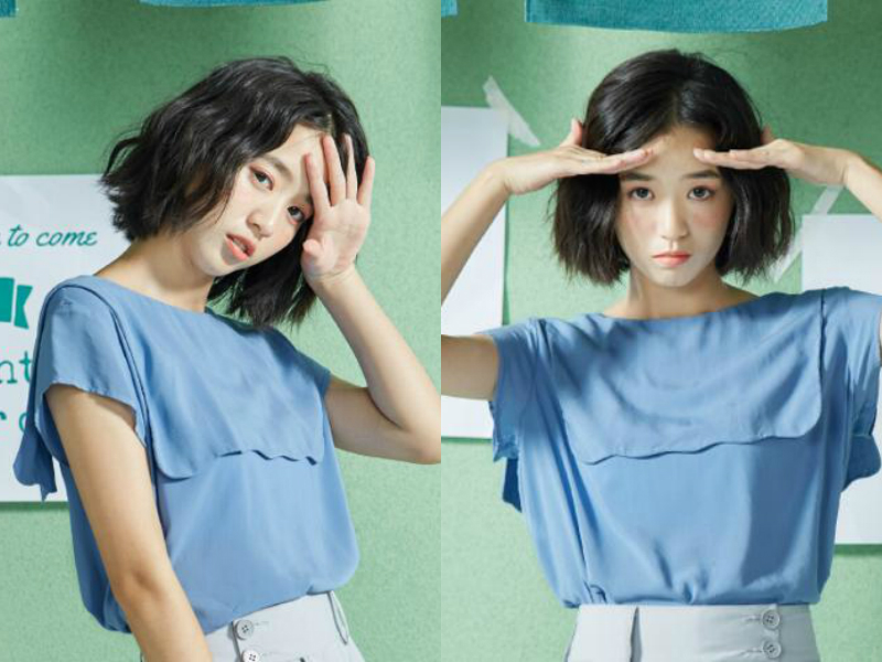 把短发进行个性的蛋花头烫发设计,发尾修剪短至两腮,使人注意力集中于妹子的脸蛋上,刘海中分,两侧蓬松的发丝贴着脸颊两侧,更加显得脸型细长,五官也凸显得愈发精致了。