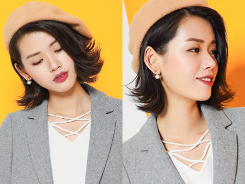 偏分的刘海形成不对称的发型,经典的黑色齐肩发尾全部外卷向上翘起,富有层次感地松散开来,突显小个性。它不仅有修颜效果,而且搭配简单的妆容服饰,看起来靓丽又知性,特别有气质。