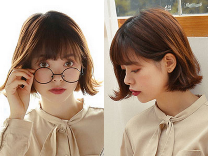 这是一款时尚的韩式短发,首先略带空气感的齐刘海清新自然,长至耳下两公分的发尾打造出外卷的造型有一份别致感,十分俏皮。露出脖子的设计有修脸的作用,衬托起脸蛋非常小巧。再搭配黑色的圆框眼镜加上呆萌的表情,更是萌萌哒!