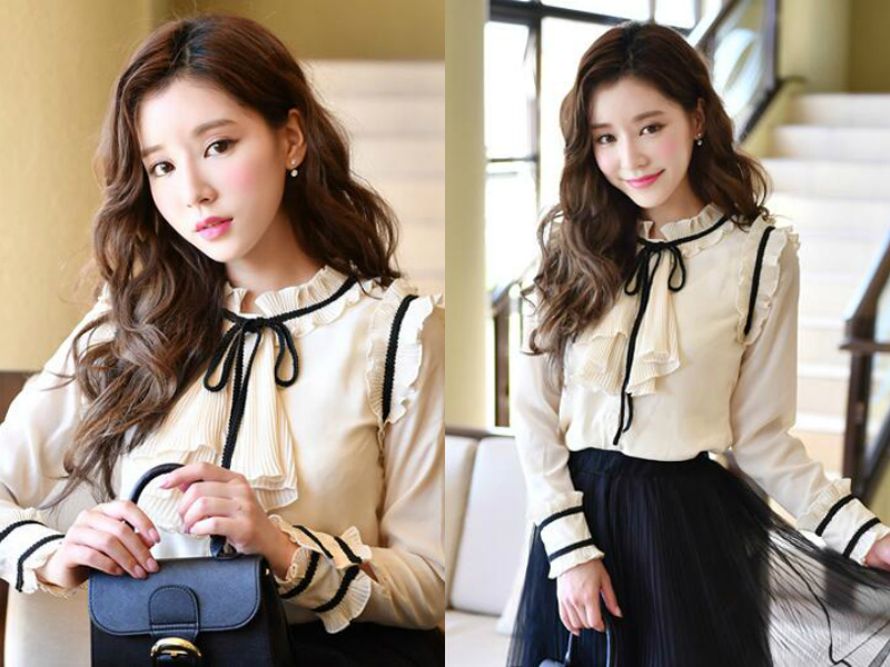 妹子一头卷烫发看起来丰盈动感,一侧卷发随意的披散在肩膀前,衬托出妹子娇俏的脸蛋,另一侧则被夹至耳后,使得妹子优美的脸部线条瞬间展露,露出甜美的笑容后看起来亲切动人,搭配一件蝴蝶结雪纺衫,更使整个人散发出优雅大方的气质。