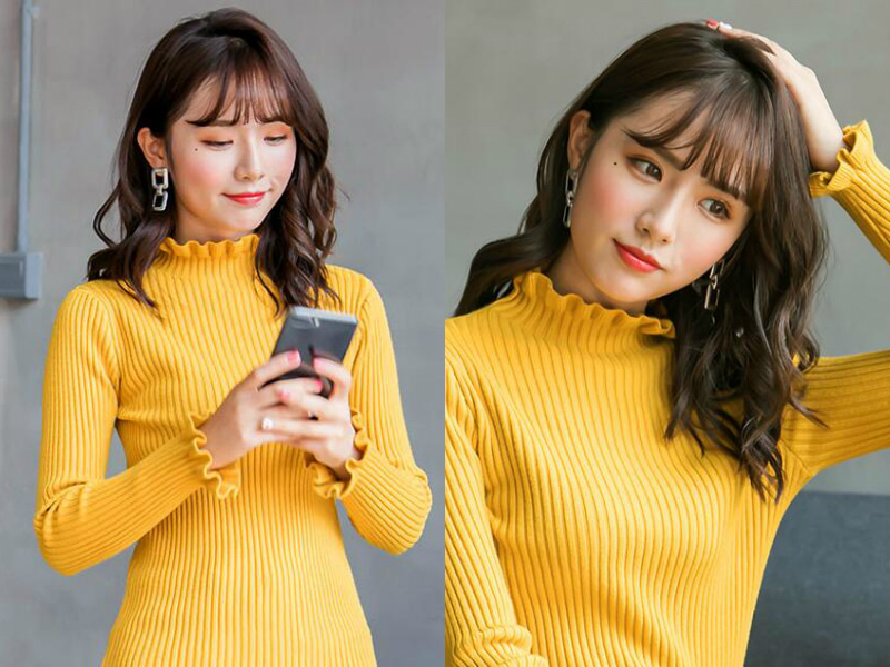 空气刘海清新修颜,薄薄的一层垂在额前显得透气感十足,遮住额头更使他人的注意力集中于妹子精致的五官上,一头齐肩的中长发经过卷烫变得充满弧度感,披散在两侧显得随意自然,加上栗色染发效果,让妹子看起来倍显温柔恬静。