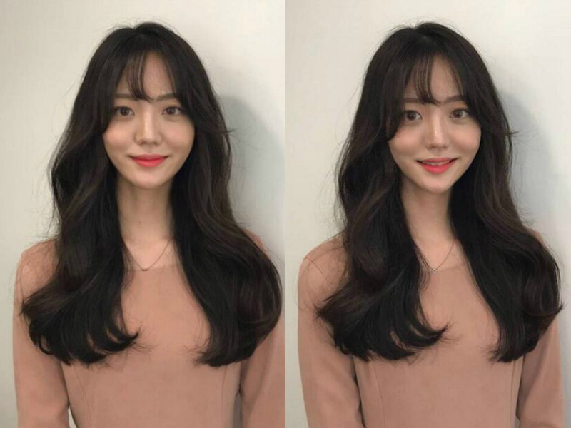 黑色是我们头发最自然原始的颜色,可以展现出女生纯真的一面。妹子在一头黑发的衬托下显得纯美清丽,经过卷烫的长发从头顶两侧滑落至肩膀,发丝起伏的线条衬得脸蛋娇美,刘海微微中分拨向两边,修饰脸型之余更凸显妹子精致立体的五官。