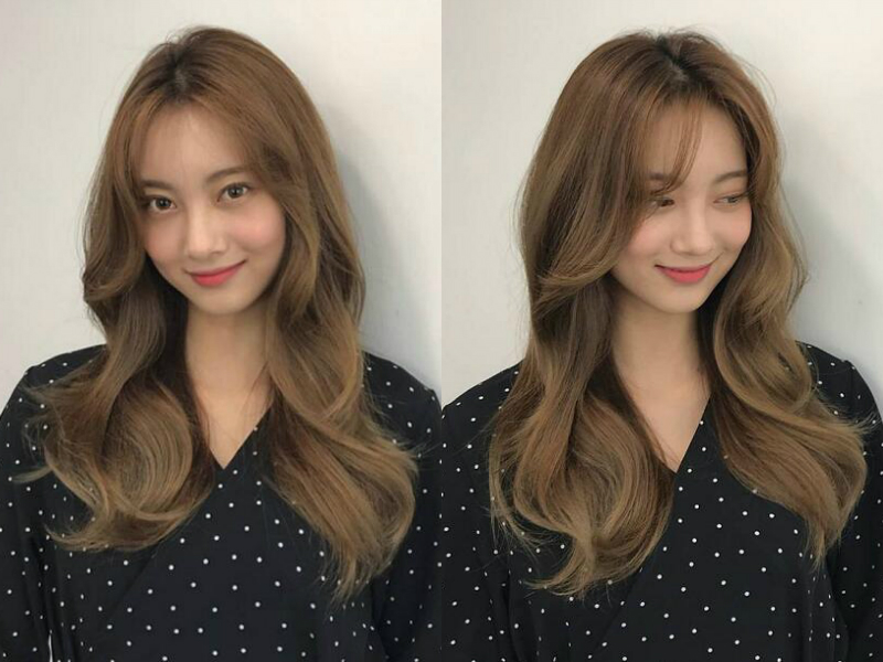 中分的刘海设计清爽透气,更突出女生精致立体的五官,弯曲起伏的波浪刘海乖巧的贴在两腮边,展现出女生优雅的曲线美,加上青木亚麻色的发色,使整款波浪微卷长发显得别致而靓丽,走在街上想必回头率很高呢!