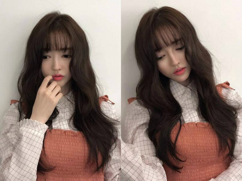 修剪齐眉的空气刘海清新减龄,贴垂在额前显得脸蛋细小,从头顶滑落下来的发丝沿着脸颊垂至胸前,除了使呈现出来的脸蛋显得更加小之外,更为妹子增添温婉动人的美感,大波浪状的发丝灵气十足,更凸显出妹子出尘般的女神气质。