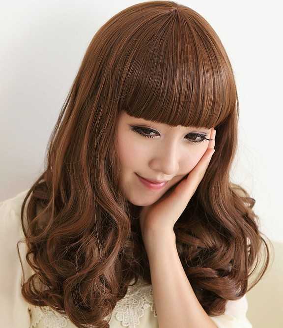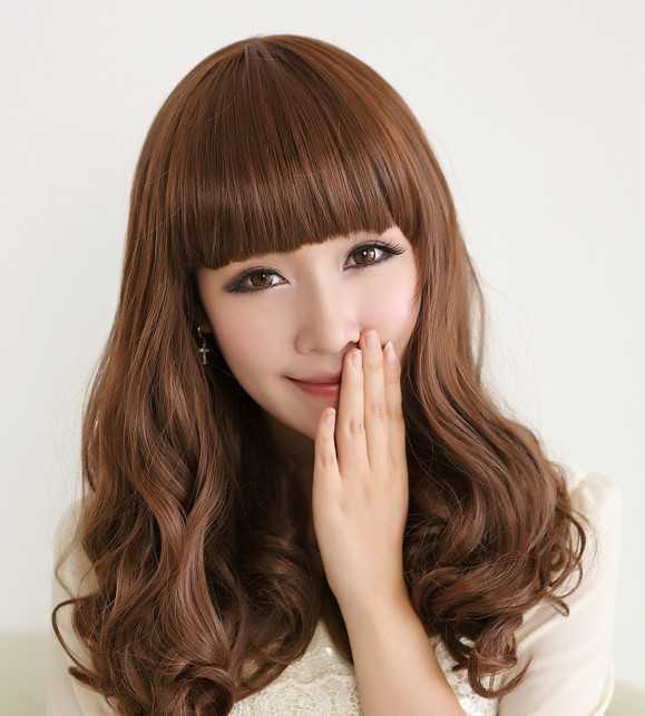 浅棕色的齐刘海梨花头是圆脸女生的最佳选择,时尚甜美的发型今年也超级流行!长长的齐刘海遮脸效果最佳。