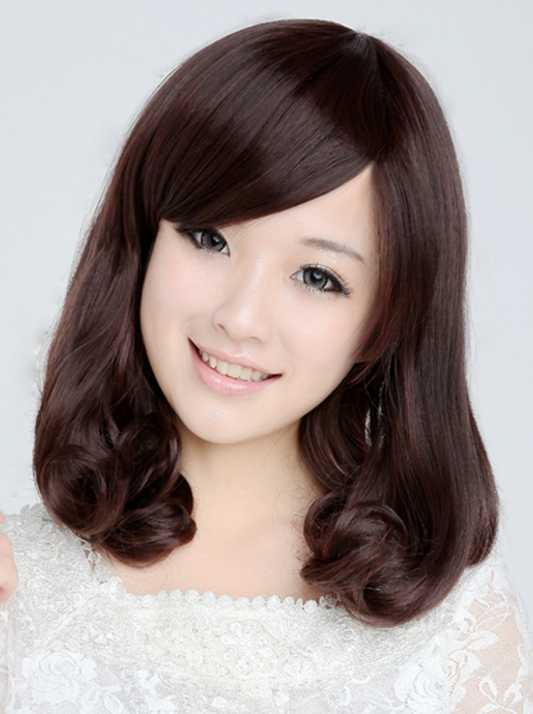 斜刘海给人一种柔和甜美的感觉,小内卷柔和的发梢使脸部线条柔和了不少哦,很可爱哦,棕红色的头发更显时尚。